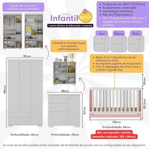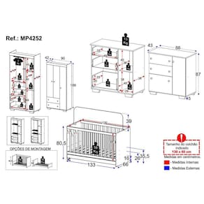 Dimensões do produto montado: Berço - Altura: 80,5cm | Largura: 133cm | Profundidade: 66cm Guarda-Roupas - Altura: 189cm | Largura: 90cm | Profundidade: 42cm Cômoda - Altura: 87cm | Largura: 88cm | Profundidade: 43cm *Você pode consultar as medidas detalhadas na imagem técnica do produto.