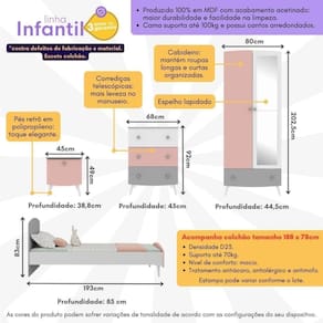 Produzido 100% em MDF, este quarto oferece resistência excepcional e um acabamento acetinado com cerca de 20% de brilho. A cama com bordas arredondadas suporta até 100 kg e garante noites de sono tranquilas e seguras. Além disso, acompanha colchão de espuma D23 com conforto macio, tratamento antiácaro, antialérgico e antimofo, indicado para até 70kg e certificado pelo INMETRO.