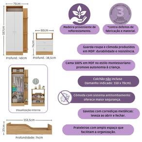 Diferenciais que encantam: - Design completo e harmonioso: guarda-roupa, cômoda e cama infantil que se complementam perfeitamente, trazendo beleza e organização ao quarto. - Guarda-roupa e cômoda produzidos em madeira de reflorestamento (MDP): resistência, durabilidade e respeito ao meio ambiente. - Acabamento acetinado com cerca de 20% de brilho: toque sofisticado e facilidade na limpeza. - Guarda-roupa funcional: 2 portas, cabideiro em madeira revestido para roupas longas e curtas, além de prateleiras externas para brinquedos ou decoração. - Cômoda versátil: possui nicho externo e 2 gavetas com corrediças metálicas, que deslizam suavemente. - Puxadores redondos em ABS: charme e delicadeza no ambiente. - Cama montessoriana 100% em MDF: suporta até 50kg, possui cantos arredondados e barras laterais com recuo, estimulando a autonomia do seu filho com segurança. - Colchão não incluso (tamanho indicado: 150x70cm).