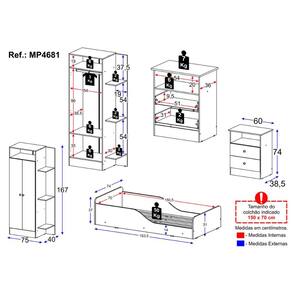 Dimensões do Produto Montado: Cama - Altura: 37cm | Largura: 153,5cm | Profundidade: 74cm Guarda-roupa - Altura: 167cm | Largura: 75cm | Profundidade: 40cm Cômoda - Altura: 74cm | Largura: 60cm | Profundidade: 38,5cm *Você pode consultar as medidas detalhadas na imagem técnica do produto.