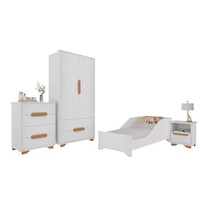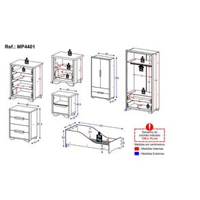 Conteúdo da Embalagem: 1 (uma) Cama Infantil 1 (um) Guarda-roupa 1 (uma) Cômoda 1 (uma) Mesa de Cabeceira Manual de Montagem Kit Ferragem