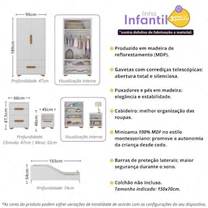 Diferenciais: - Resistência e facilidade na limpeza: conjunto produzido em MDP com acabamento acetinado (cerca de 20% de brilho). - Cama infantil 100% MDF no estilo montessoriano: incentiva a independência desde os primeiros anos de vida. - Proteção: barras laterais que garantem a segurança do seu filho durante o sono. - Organização eficiente: guarda-roupa com 2 portas, 2 gavetas e cabideiro metálico, mantendo as roupas bem acomodadas e sem amassar. - Praticidade no dia a dia: cômoda com 4 gavetas e mesa de cabeceira com 1 gaveta. - Qualidade superior: corrediças telescópicas que promovem a abertura total e silenciosa das gavetas. - Estabilidade e delicadeza: pés e puxadores de madeira maciça com design moderno. - Colchão não incluso (tamanho indicado: 150x70cm).