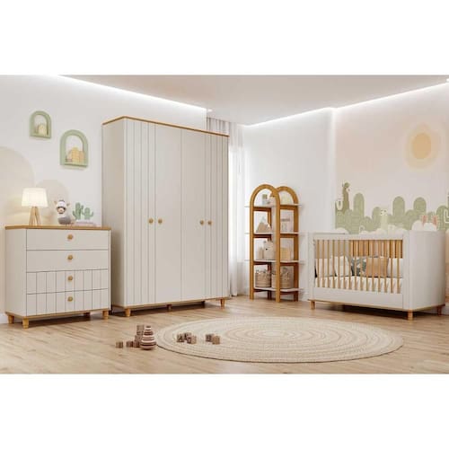 Quarto Infantil Completo Cupcake 4 Peças (Guarda Roupa+Cômoda+Berço+Estante) QI103 Off White/Nature - Permóbili Baby