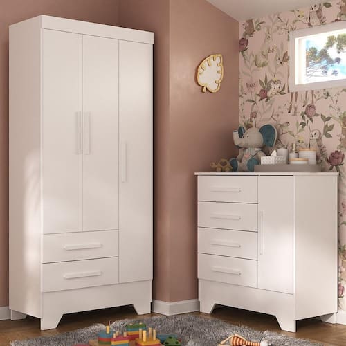 Quarto Infantil Completo Guarda Roupa 3 Portas 2 Gavetas com Cômoda Selene Branco. O Quarto Infantil Selene é um conjunto encantador composto por um guarda-roupa e uma cômoda. O guarda-roupa possui uma estrutura sólida com detalhes em MDP de 12mm e 15mm, garantindo durabilidade e estilo. O mesmo padrão de construção se aplica à cômoda. Ambos os móveis oferecem corrediças suaves, puxadores elegantes em MDF e uma pintura UV fosca moderna no interior. A montagem é facilitada com instruções detalhadas e embalagem segura. Os pés estilo retro adicionam um toque de charme. Este conjunto cria um ambiente de conto de fadas para o quarto do seu filho. Ean: 7909903426562