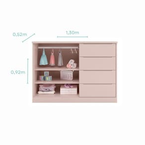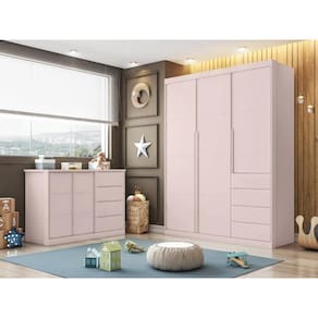 Quarto Infantil Completo Pérola Roupeiro e Cômoda 4 Gavetas Rose. Dê ao seu bebê um quarto dos SONHOS com esta linha completamente encantadora! Ela conta com detalhes altamente sofisticados. O Roupeiro possui amplas divisões internas que permitem a organização de todas as roupinhas e enxovais do bebê, uma linha versátil que permite ser usada ao longo do crescimento. Conta com 3 portas e 4 espaçosas gavetas que deslizam suavemente devido a tecnologia das corrediças telescópicas, sem falar do sistema de travas de segurança que é acionada após a sua abertura completa. Os puxadores em modelo cava são embutidos e dificultam o acesso do bebê. Já as prateleiras são removíveis, auxiliando a mamãe a organizar da melhor forma que preferir. Para manter as roupinhas que são mais utilizadas, com praticidade, os cabideiros inclusos contribuem perfeitamente. Ean: 7909903407295