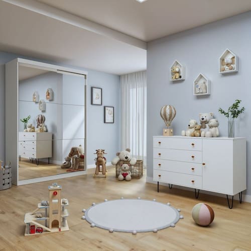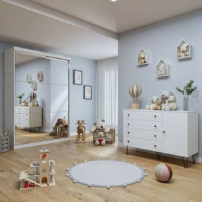 Bem-vindo ao lugar onde a organização se encontra com a diversão - apresentamos nosso incrível Conjunto de Móveis para quarto Infantil, uma obra-prima projetada para trazer alegria e organização aos espaços dos pequenos com a decoração para quarto infantil perfeita! O guarda roupa com porta espelhada tem o design moderno que organiza roupas, brinquedos e acessórios. Além, claro, da cômoda que deixa tudo sempre em ordem. Perfeito para qualquer decoração infantil. Ambiente Principal: Quarto Infantil Complexidade da Montagem: Alta: deve ser montado por um montador especializado Cor: Branco Cor do Produto: Branco Escala de Brilho: Semi-Brilho Manual de Montagem e Instalação: https://cdn2.madeiramadeira.com.br/prd/minastex/2152396-KIT%2018.pdf Material Principal: MDP Medida de Cada Item: Guarda Roupa: 218cm x 138cm x 53,5cm Cômoda: 92,7cm x 129,5cm x 41,5cm modular: Não Necessita Montagem: Sim Origem do Produto: Nacional Peso: Guarda Roupa: 121kg , Cômoda:41,5kg Possui Portas: Não Recomendações de Uso, Manutenção e Limpeza: Limpar com pano macio e levemente umedecido. Não utilizar solventes a base e de inflamáveis. Não utilizar produtos abrasivos. Sistema de Montagem: Parafusos e cavilhas. Suporta Até (kg): Guarda Roupa: 70Kg Cômoda: 40kg