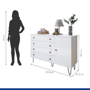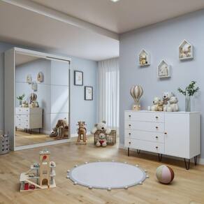 O Guarda-Roupa Lumi combina espelhos e um design funcional para otimizar o quarto infantil. Com 2 portas espelhadas, ele amplia o ambiente e facilita a organização das roupas, enquanto as 2 gavetas são perfeitas para itens menores. A cômoda Aurora, com 1 porta e 4 gavetas, oferece ainda mais espaço para a criança guardar suas roupas e brinquedos. Ideal para quem busca estilo e praticidade no quarto infantil. O espelho é seguro para o quarto de crianças? Sim, o espelho tem um acabamento seguro e é uma ótima opção para decoração e desenvolvimento. A cômoda tem capacidade suficiente para roupas de bebê? Sim, as 4 gavetas são amplas e ideais para armazenar roupas, brinquedos e acessórios.