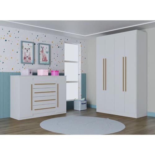 O Quarto Infantil Guarda Roupa 4 Portas e Cômoda 4 Gavetas 2 Portas Lucca Poquema O Quarto Infantil Lucca Poquema é a solução perfeita para manter o ambiente dos pequenos sempre bonito e bem organizado. Composto por um guarda roupa de 4 portas e uma Cômoda com 4 gavetas e 2 portas, ele oferece amplo espaço interno para acomodar roupas, brinquedos e outros itens essenciais do dia a dia. Seu design moderno trazem um toque de elegância ao ambiente, tornando-o mais aconchegante e funcional. Além disso, a disposição dos compartimentos facilita a organização, proporcionando mais praticidade para a rotina da família. Invista em um quarto infantil que alia qualidade, beleza e eficiência para um espaço mais harmonioso e agradável!