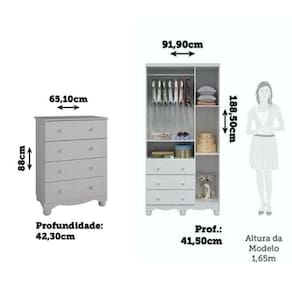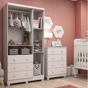 Cômoda: 88 x 65,1 x 42,3 (AxLxP - cm) Altura do Conjunto: 188,5 cm Ambiente Principal: Quarto Infantil Complexidade da Montagem: Alta: deve ser montado por um montador especializado Cor: Branco Brilho Cor do Produto: Branco Brilho Escala de Brilho: Brilhante Informações Complementares: Pode ser montado com rodapé usinado (torneado) ou reto. Linha ou Coleção: Mimo Manual de Montagem e Instalação: https://cdn2.madeiramadeira.com.br/atributo/moveis-peroba/1775078-manual-6497.pdf Material Principal: MDF Medida de Cada Item: Guarda Roupa: 188,5 x 91,9 x 41,5| Cômoda: 88 x 65,1 x 42,3 (AxLxP - cm) modular: Não Necessita Montagem: Sim O Conjunto Contém: Cômoda/Guarda-Roupa Origem do Produto: Nacional Peso: 29.9 Pintura Atóxica: Sim Possui Portas: Sim Quantidade de Portas: 03 Recomendações de Uso, Manutenção e Limpeza: Para limpeza utilizar somente pano limpo e macio, ligeiramente umedecido em água (apenas o bastante para remover a poeira), seguido de um pano seco. Sistema de Montagem: Parafusos autoatarraxantes, conjuntos minifix, cavilhas de madeira, acessórios plásticos e metálicos Suporta Até (kg): 40