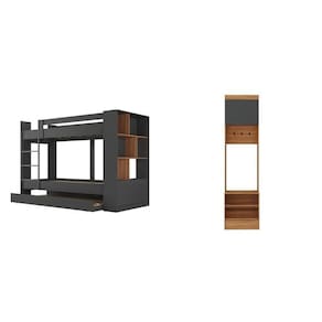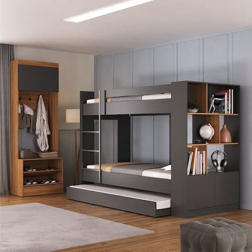 O Quarto Juvenil Completo com Treliche e Sapateira Porto é a escolha ideal para otimizar o espaço e garantir conforto. O treliche, que conta com estante e 2 portas, possui estrutura em MDP com acabamento em Finish Foil, suportando até 80 kg por cama e adequado para colchões de solteiro. Com 6 nichos, oferece ampla capacidade de armazenamento, mantendo a organização do ambiente. A sapateira Viena, com 1 porta e 2 prateleiras, apresenta um design moderno e acomoda de 1 a 10 pares de calçados, contribuindo para a arrumação. Ambas as peças possuem garantia de 3 meses e são fáceis de montar, assegurando um quarto estiloso e funcional. Possui Portas: 01 Possui Rodízio: Sim Acompanha Colchão: Não Altura do Conjunto: 204.5 cm Ambiente: null Ambiente Principal: Quarto Cor: Grafite/Nogal Informação Complementar: 1x Treliche com Estante 2 Portas 6 Nichos Grafite/Nogal Largura: 215,5 cm Altura: 157 cm Peso: 100 kg Profundidade: 97,5 cm Necessita Montagem: Sim