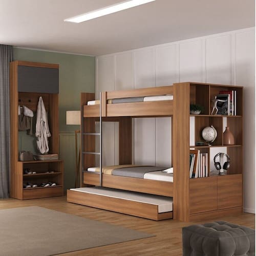 O Quarto Juvenil Completo com Treliche e Sapateira Porto é a escolha ideal para otimizar o espaço e garantir conforto. O treliche, que conta com estante e 2 portas, possui estrutura em MDP com acabamento em Finish Foil, suportando até 80 kg por cama e adequado para colchões de solteiro. Com 6 nichos, oferece ampla capacidade de armazenamento, mantendo a organização do ambiente. A sapateira Viena, com 1 porta e 2 prateleiras, apresenta um design moderno e acomoda de 1 a 10 pares de calçados, contribuindo para a arrumação. Ambas as peças possuem garantia de 3 meses e são fáceis de montar, assegurando um quarto estiloso e funcional. Possui Rodízio: Sim Acompanha Colchão: Não Altura do Conjunto: 204.5 cm Ambiente: null Ambiente Principal: Quarto Cor: Nogal/Grafite Informação Complementar: 1x Treliche com Estante 2 Portas 6 Nichos Nogal Largura: 215.5 Altura: 157 Peso: 100 Profundidade: 97.5 Necessita Montagem: Sim