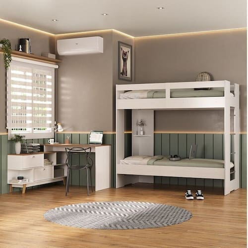 O Quarto Juvenil completo Nexis com Beliche e escrivaninha em L 2 Portas une praticidade e estilo. A beliche, com estrutura em MDP 15mm e acabamento fosco em Finish Foil, oferece resistência e um design moderno. A escrivaninha em L, também em MDP 15mm, destaca-se pelas 2 portas basculantes e acabamento sofisticado em Finish Foil, proporcionando um ambiente organizado e elegante. Ideal para otimizar o espaço com qualidade e estilo.