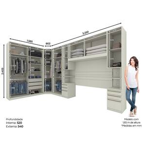 ESPECIFICACOES TECNICAS: Qtd. Portas: 11 Und. Tipo Porta: Bater/Correr Material da Porta: MDP Tipo de Puxador da Porta: Externo Material do Puxador Porta: Aluminio Tipo de Dobradica: 35mm Soft Close Qtd. Gavetas: 9 Und. Material da Gaveta: MDF/MDP Tipo de Gaveta: Interna/Externa Material da Corredica: Metalica Telescopica Material do Puxador Gaveta: Aluminio Peso Maximo por Gaveta: 3 Kg Possui Organizador de Gaveta: Nao Possui Espaco para Vestidos Longos: Sim Possui Ganchos: Nao Possui Iluminacao Led: Nao Possui Maleiro: Sim Possui porta Objetos: Nao Qtd. Prateleiras: 14 Und. Material da Prateleira: MDP Peso Maximo por Prateleira: 8 Kg Nicho com Cabideiro: Sim Possui Cabideiros e calceiros: 3 Und.3 Und. Possui Espelho ou Vidro: Nao Tipo Roupeiro: Modulado Quantidade de Pecas: 6 Und. Modular: Sim O Modulo Pode ser Utilizado Individualmente: Sim Medidas Montado -A x L x P-: 240,5 x 406,5 x 54cm Peso Produto Montado -Kg-: 139Kg Produto Suporta ate -Kg-: 90 Kg Informacoes Complementares: Gavetas com corredicas telescopicas Puxadores, cabideiros e calceiros em aluminio Material Principal: MDP
