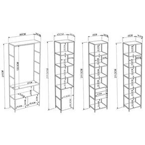 Dimensões dos Produtos (Largura x Altura x Profundidade): Estante: 90 x 211 x 36 cm. Estante Estreita: 45 x 211,5 x 36 cm. Peso: 92 Kg.