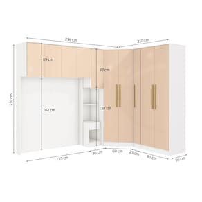 Para quem sempre sonhou com um quarto planejado, o Modulado Adapt da Kappesberg é a escolha certa. Produzido em MDP de 15mm, o que proporciona mais robustez, firmeza e qualidade, o Combo CB1160 conta com sete peças, sendo a composição perfeita para todos os ambientes, garantindo o espaço ideal para organizar roupas e calçados com beleza e funcionalidade. Unindo peças curingas e muito versáteis, os módulos são individuais, permitindo a montagem conforme o seu espaço e preferência. Com altura de 2,30m e 56cm de profundidade, os módulos contam com amplo espaço e uma ótima divisão interna, com nichos de tamanhos diferentes, ideais para guardar calçados e roupas dobradas. Os cabideiros, metálicos e de suporte interno, permitem organizar peças maiores, como casacos e vestidos sem amassar. Já as gavetas, com corrediças telescópicas, garantem uma melhor otimização de espaço e são perfeitas para acessórios e peças menores, deixando seu quarto sempre organizado. E para um melhor aproveitamento de espaço na vertical, os aéreos são uma ótima opção, permitindo organizar travesseiros e cobertores com facilidade. Com formato em L, o módulo de canto é uma das peças centrais do ambiente, e para noites de sono ainda mais confortáveis, o combo conta com painel e cabeceira estofada, acomodando camas de casal tradicional, de 138cm, deixando seu quarto completo. Outros módulos, como a mesa de cabeceira com prateleira tornam o projeto único, garantindo o quarto dos sonhos. E com sete camadas de pintura, tanto na parte interna quanto na externa, a caixaria conta com pintura na cor branca, enquanto que as portas, são na cor macadâmia, ambas com acabamento em brilho. Uma combinação linda e elegante, ideal para quem busca por ambientes diferenciados e com mais luminosidade. Os destaques ficam com o sistema de amortecimento nas portas, garantindo um fechamento suave e sem ruídos, e dos puxadores em MDF na cor dourada, completando os diferenciais do produto e deixando seu quarto do jeito que você sempre sonhou. Renove seu quarto com toda a qualidade e beleza que o Modulado Adapt da Kappesberg oferece e aproveite cada momento.