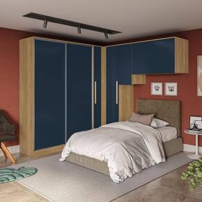 Para quem sempre sonhou com um quarto planejado, o Modulado Adapt da Kappesberg é a escolha certa. Produzido em MDP de 15mm, o que proporciona mais robustez, firmeza e qualidade, o Combo seis peças CB1157 possui o tamanho ideal para quartos de solteiro, oferecendo mais funcionalidade. Modulado, você pode dispor os módulos conforme o seu espaço e preferência. Com 2,30m de altura, o combo conta com um roupeiro de canto reto, que junto com os demais módulos, otimiza espaço, permitindo composições em L, garantindo organização e beleza. Com ótimas divisões internas, os módulos possuem nichos de tamanhos diferentes, ideais para guardar calçados e roupas dobradas. Os cabideiros, metálicos e de suporte interno, permitem organizar peças maiores, como casacos e vestidos sem amassar. Já as gavetas, com corrediças telescópicas, garantem uma melhor otimização de espaço e são perfeitas para acessórios e peças menores, deixando seu quarto sempre organizado. Com aéreos e maior espaço na vertical, você organiza cobertas e travesseiros com facilidade. E para deixar seu quarto com cara de planejado, o combo acompanha uma cabeceira estofada, ideal para camas de solteiro de até 90cm, deixando seus momentos de descanso ainda mais confortáveis. Com sete camadas de pintura, tanto na parte interna quanto na externa, a caixaria conta com pintura touch na cor nogueira, com a textura dos veios da madeira, e as portas, com pintura na cor azul profundo, possuem acabamento fosco. Uma combinação marcante e moderna, que garantirá estilo e aconchego ao espaço, ideal para quem busca por um design único e elegante. O diferencial fica por conta do sistema de amortecimento nas portas, garantindo um fechamento suave e sem ruídos, além de mais durabilidade, e os puxadores em MDF na cor dourada e em alumínio, completam a beleza do produto, deixando seu quarto do jeito que você sempre sonhou. Renove seu quarto com toda a qualidade e beleza que o Modulado Adapt da Kappesberg oferece e aproveite cada momento.