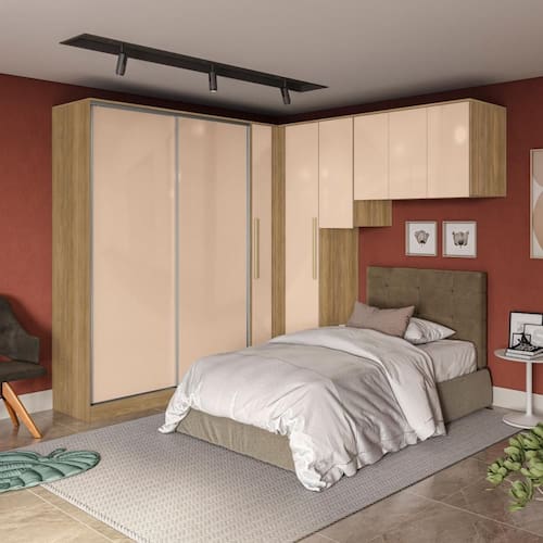 Para quem sempre sonhou com um quarto planejado, o Modulado Adapt da Kappesberg é a escolha certa. Produzido em MDP de 15mm, o que proporciona mais robustez, firmeza e qualidade, o Combo CB1157 conta com seis peças, sendo a composição perfeita para todos os ambientes, garantindo o espaço ideal para organizar roupas e calçados com beleza e funcionalidade. Unindo peças curingas e muito versáteis, os módulos são individuais, permitindo a montagem conforme o seu espaço e preferência. Com altura de 2,30m e 56cm de profundidade, os módulos contam com amplo espaço e uma ótima divisão interna, com nichos de tamanhos diferentes, ideais para guardar calçados e roupas dobradas. Os cabideiros, metálicos e de suporte interno, permitem organizar peças maiores, como casacos e vestidos sem amassar. Já as gavetas, com corrediças telescópicas, garantem uma melhor otimização de espaço e são perfeitas para acessórios e peças menores, deixando seu quarto sempre organizado. E para um melhor aproveitamento de espaço na vertical, os aéreos são uma ótima opção, permitindo organizar travesseiros e cobertores com facilidade. Com formato em L, o módulo de canto é uma das peças centrais do ambiente, e para noites de sono ainda mais confortáveis, o combo conta com cabeceira estofada, acomodando camas de solteiro, deixando seu quarto completo. E com sete camadas de pintura tanto na parte interna quanto na externa, a caixaria conta com pintura touch na cor nogueira, contando com a textura dos veios da madeira, enquanto que as portas, com pintura na cor macadâmia, possuem acabamento em brilho. Uma combinação moderna e elegante, que garantirá estilo e aconchego ao espaço, ideal para quem busca por um design único, deixando seu quarto perfeito. Os destaques ficam com o sistema de amortecimento nas portas, garantindo um fechamento suave e sem ruídos, e dos puxadores em MDF na cor dourada e em alumínio, completando os diferenciais do produto e deixando seu quarto do jeito que você sempre sonhou. Renove seu quarto com toda a qualidade e beleza que o Modulado Adapt da Kappesberg oferece e aproveite cada momento.