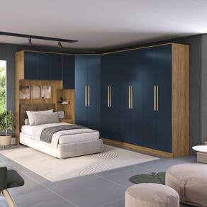 Para quem sempre sonhou com um quarto planejado, o Modulado Adapt da Kappesberg é a escolha certa. Produzido em MDP de 15mm, o que proporciona mais robustez, firmeza e qualidade, o Combo seis peças CB1163 é ideal para quartos de solteiro, oferecendo funcionalidade. Modulado, você pode dispor os módulos conforme o seu espaço e preferência. Com 2,30m de altura, o combo conta com um roupeiro de canto oblícuo, que junto com os demais módulos, otimiza espaço, permitindo composições em L, garantindo organização e beleza. Com ótimas divisões internas, os módulos possuem nichos de tamanhos diferentes, ideais para guardar calçados e roupas dobradas. Os cabideiros, metálicos e de suporte interno, permitem organizar peças maiores, como casacos e vestidos sem amassar. Já as gavetas, com corrediças telescópicas, garantem uma melhor otimização de espaço e são perfeitas para acessórios e peças menores, deixando seu quarto sempre organizado. Com aéreo e maior espaço na vertical, você organiza cobertas e travesseiros com facilidade. E para deixar seu quarto com cara de planejado, o combo acompanha um painel de acabamento e cabeceira estofada, ideal para camas de solteiro de até 90cm, e com complemento com mesa de cabeceira, seus momentos de descanso serão ainda mais completos. Com sete camadas de pintura, tanto na parte interna quanto na externa, a caixaria conta com pintura touch na cor nogueira, com a textura dos veios da madeira, e as portas, com pintura na cor azul profundo, possuem acabamento fosco. Uma combinação marcante e moderna, que garantirá estilo e aconchego ao espaço, ideal para quem busca por um design único e elegante. O diferencial fica por conta do sistema de amortecimento nas portas, garantindo um fechamento suave e sem ruídos, além de mais durabilidade, e os puxadores, em MDF na cor dourada e em alumínio, completam a beleza do produto, deixando seu quarto do jeito que você sempre sonhou. Renove seu quarto com toda a qualidade e beleza que o Modulado Adapt da Kappesberg oferece e aproveite cada momento.