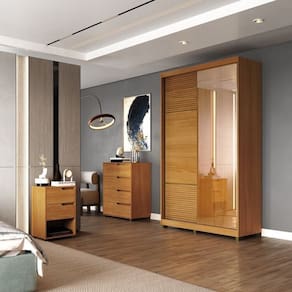 Um roupeiro 100% em MDF de 15mm, conta com 02 gavetas internas, corrediças telescópicas, cabideiro em alumínio, pés antiumidade, fundos antimofo, duas portas de correr: uma com espelho e outra com acabamento grafiatto além de puxadores em alumínio.
