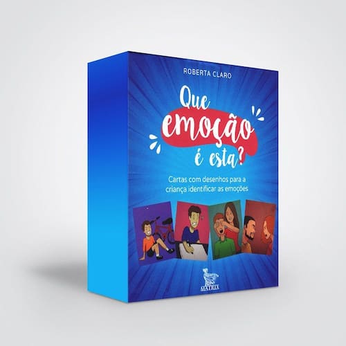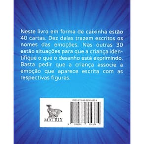 Neste livro em forma de caixinha estão 40 cartas. Dez delas trazem escritos os nomes das emoções. Nas outras 30 estão situações para que a criança identifique o que o desenho está exprimindo. Basta pedir que a criança associe a emoção que aparece escrita com as respectivas figuras.