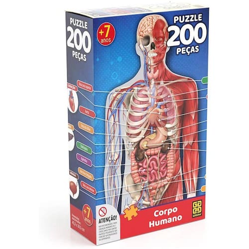 Um quebra-cabeça para você conhecer um pouco mais sobre a anatomia humana! Ele traz uma imagem do corpo humano ilustrando os órgãos, como coração, rins, pulmões, estômago e intestino, e suas ligações, com destaque especial para o coração e o globo ocular. A imagem deste quebra-cabeça é meramente ilustrativa. As cores e os tamanhos dos órgãos não são exatamente estes.