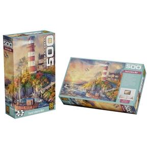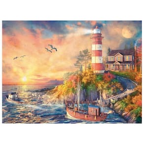 Deixe-se levar pela calmaria do entardecer com este quebra-cabeça que parece uma pintura viva. A imagem retrata um farol à beira-mar, iluminado pelos últimos raios dourados do pôr do sol, guiando com firmeza os barcos que retornam para casa ao cair da noite.