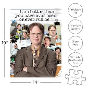 - Quebra-cabeça de 500 peças: Você vai adorar montar este quebra-cabeça de 500 peças, apresentando uma citação inspiradora do seu personagem favorito no The Office, Dwight Schrute - Assistente do Gerente Regional. O quebra-cabeça completo mede 35,5 x 48,2 cm