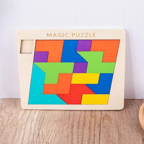 - O jogo de quebra-cabeça Tangram Brain Teaser da Wooden Toys tem vários exemplos de formas e coisas para fazer com ele. Este brinquedo de quebra-cabeças é do estilo Montessori e pode promover o raciocínio lógico, a resolução de problemas e o reconhecimento espacial. O quebra-cabeça de madeira vem com 15 peças de blocos de madeira em várias formas e uma tábua de madeira. O pacote contém instruções detalhadas para um novo jogador