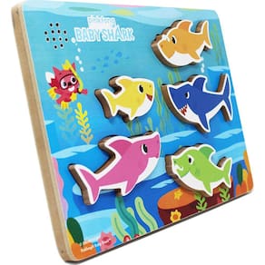 PRODUTO INTERNACIONAL. Conheça o quebra-cabeça sonoro Chunky Wood Baby Shark da Pinkfong! Com peças extra grossas, seu bebê pode facilmente pegar e encaixar. Além disso, cada peça reproduz uma parte da famosa música Baby Shark, garantindo horas de diversão e aprendizagem para o seu pequeno