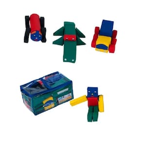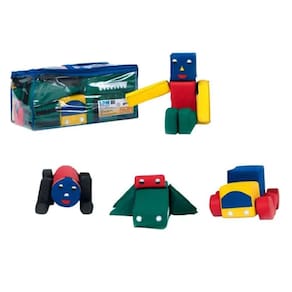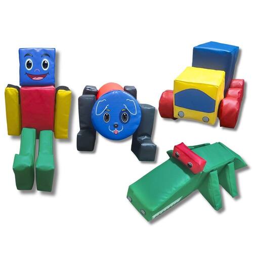 Conjunto composto por 4 módulos: jacaré, cachorro, robô e caminhão, totalizando 29 peças costuradas com fecho de contato