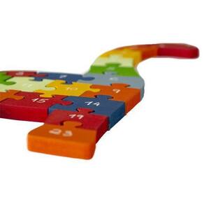Quebra-cabeça educativo em formato de dinossauro Braquiossauro, com 26 peças coloridas. De um lado o alfabeto de A a Z, do outro a sequência de números de 1 a 26. Brinquedo confeccionado artesanalmente em madeira de reflorestamento e pintado com tinta atóxica. Nossos brinquedos são elaborados para atender diversas idades e feitos a mão com muito carinho