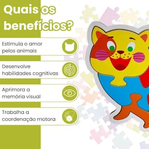 Material resistente: MDF durável e seguro para os pequenos. Design encantador: Personagens de gatos que as crianças vão adorar Peças grandes e fáceis de manusear: Ideal para crianças pequenas. Estimula habilidades: Desenvolvimento motor, concentração e raciocínio lógico.