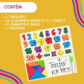 - Marca: Toy Mix - Dimensões: 30 x 30 x 2 cm - Contém: 01 Tabuleiro com Quadro Branco, 1 Canetinha, 7 peças de Tangram , números do 1 ao 20 e sinais. - Faixa Etária: indicado para crianças à partir de 3 anos - EAN: 7908770604783 - Certificado pelo INMETRO Registro 002962/2021 OCP01661 Marca: Não Informado