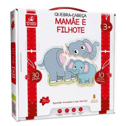 Quebra Cabeça Mamãe e Filhote 2105 - Brincadeira de Criança O quebra-cabeça mamãe e filhote é um jogo educativo que auxilia no desenvolvimento do raciocínio lógico, na atenção, na percepção visual e na concentração das crianças. As peças têm cores vibrantes, e figuras lúdicas, fazendo com que as crianças aprendam se divertindo. Feito de madeira. Contém: 10 Quebra-cabeças; 30 peças Possui certificado INMETRO. Recomendado para 4 anos.