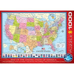Mapa EuroGráfico do Mundo 1000-Piece Puzzle. Tamanho da caixa: 10" x 14" x 2,37". Tamanho finalizado: 19,25" x 26,5". O Mapa dos Estados Unidos inclui grandes cidades e capitais, juntamente com bandeiras estaduais.