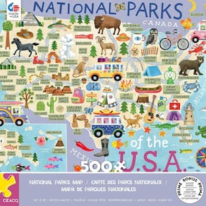 Ceaco - Mapa dos Parques Nacionais - Quebra-cabeça de 500 peças - Contém um quebra-cabeça de 500 peças. - Molde feito à mão com formas distintas, fabricado nos EUA com métodos sustentáveis. - Apresenta visuais vibrantes. - Colecione todos os estilos da sua coleção favorita. - Ótimo para noites em família, presentes, reuniões de férias, festas e muito mais. Quebra-cabeça de alta qualidade, inovador e desafiador da Ceaco, intrigando milhões desde 1987!