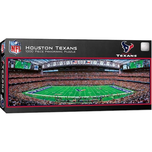 Quebra-cabeça panorâmico Master Pieces NFL Houston Texans Stadium, 1000 peças, cor do time, 33 cm x 99 cm - Dr. Toy Award of Excellence - 100 melhores brinquedos - Produto oficialmente licenciado pela NFL - 1000 peças em quebra-cabeça acabado de 33 cm por 99 cm. Adequado para emoldurar quando montado - O tabuleiro de quebra-cabeça espesso reciclado e as peças de corte aleatório garantem um ajuste justo e criam uma experiência divertida - O quebra-cabeça mede 33 x 99 cm quando montado - O quebra-cabeça é adequado para emoldurar quando montado - 1000 peças interligadas - Horas de diversão para maiores de 13 anos - Oficialmente licenciado