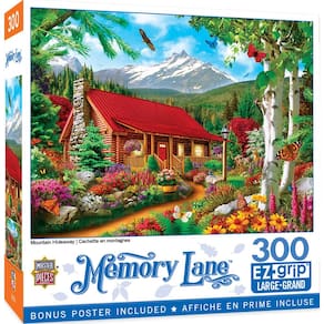MasterPieces - Quebra-cabeça de 300 peças, formas grandes de aderência EZ, refúgio de montanha, diversão para adultos, idosos, família, crianças, acabamento sem brilho, 45,7 cm x 61 cm - PEÇAS EXTRA GRANDES: Nossos quebra-cabeças EZ Grip apresentam peças grandes e mais grossas para facilitar a coleta e manipulação; cuidadosamente trabalhados com crianças pequenas e idosos em mente; projetados para serem divertidos e mentalmente estimulantes; ajudam no relaxamento; aumentam as habilidades de resolução de problemas; ótima atividade social com a família e amigos - Formas exclusivas: o quebra-cabeça possui 300 peças em uma variedade de cortes, garantindo um desafio; peças entrelaçadas se encaixam para um ajuste seguro; acabamento fosco antirreflexo reduz o cansaço visual; um pôster vibrante e colorido está incluído para referência enquanto você o monta - Responsável pelo meio ambiente: nossos quebra-cabeças são feitos de material 100% reciclado e tintas à base de soja não tóxicas - Entretenimento para todos: a coleção MasterPieces oferece a maneira perfeita de manter a diversão noturna do jogo; selecione entre quebra-cabeças para adultos, idosos e crianças; baralhos exclusivos de baralho, jogos de tabuleiro, dominó, kits de artesanato e muito mais