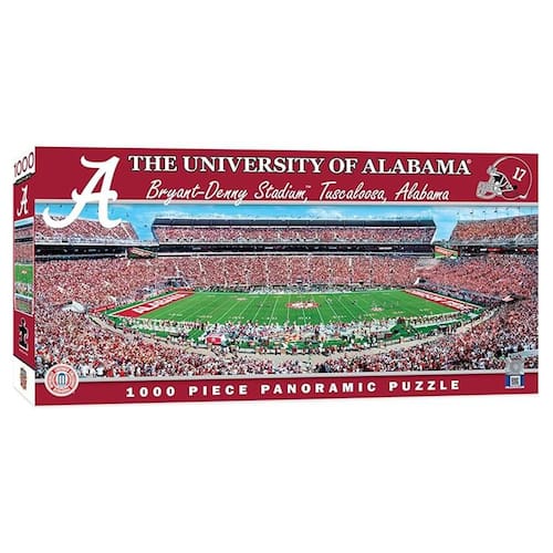 MasterPieces Quebra-cabeça esportivo de 1000 peças - NCAA Alabama Crimson Tide Center View Panoramic - 33 x 99 cm - Dr. Toy Award of Excellence - 100 melhores brinquedos - Produto universitário oficialmente licenciado - 1000 peças em quebra-cabeça acabado de 33 cm por 99 cm. Adequado para emoldurar quando montado - O tabuleiro de quebra-cabeça reciclado grosso e as peças de corte aleatório garantem um ajuste firme e criam uma experiência divertida