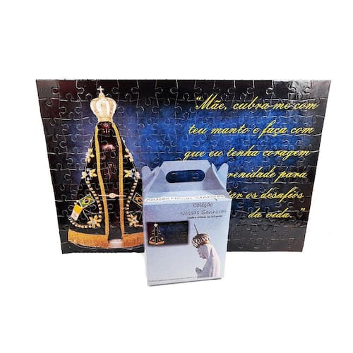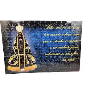 Quebra-Cabeça Nossa Senhora Aparecida De 300 Peças: nossa nova linha de quebra-cabeças personalizados com temas religiosos apresenta esse modelo especial. Feito em mdf, esse quebra-cabeça pode ser montado e colocado em um quadro decorativo em sua casa. Acompanha uma caixa exclusiva e diferenciada com a imagem para orientação da montagem, além de informações, textos e oração do terço.