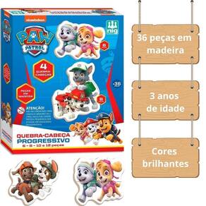 Quebra cabeça educativo super fofinho em madeira, fácil de montar e resistente. As crianças vão testar sua capacidade de concentração e memória, encaixando as pecinhas com os personagens da patrulha canina. Quebra cabeça progressivo 6,8,10,12 peças produto e licenciado pela nig brinquedos. Para a nig brinquedos é uma enorme satisfação oferecer ao seu cliente 60 anos de experiência, com muitas histórias de sucesso e comprometimento com as crianças. Toda linha de jogos e brinquedos da marca passa pela aprovação do inmetro instituto nacional de metrologia, normalização e qualidade industrial com a certificação do sgq sistema de gestão da qualidade . A nig oferece diversão, entretenimento e atividades pedagógicas com produtos de qualidade nas linhas de brinquedos, madeira, licenças, jogos, quebra-cabeças e eva. ---------------------------------------------------------- informações técnicas ---------------------------------------------------------- idade: 3+ país fabricante: brasil marca: nig brinquedos garantia: 30 dias contém: 36 peças em madeira