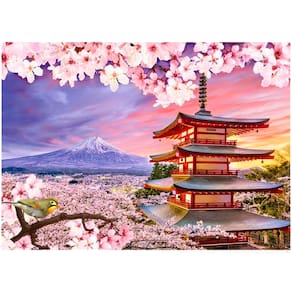 Descrição do produto : " Um cenário sereno e deslumbrante com o tradicional pagode japonês emoldurado por flores de cerejeira e o imponente Monte Fuji ao fundo. Um convite à paz, à cultura e à beleza natural! A partir de 10 anos Quantidade de peças: 1008 Dimensões aproximadas: 50 x 70 cm : "