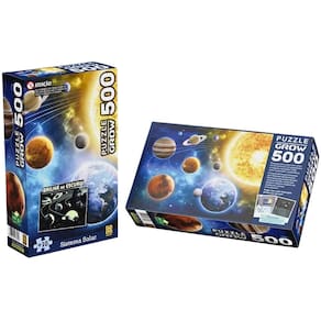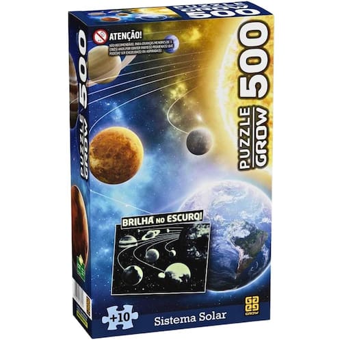 Explore os mistérios do universo peça por peça com o Quebra-Cabeça 500 Peças Sistema Solar, da Grow. Um modelo especial com tinta que brilha no escuro, criando um efeito surpreendente após a montagem. Durante o dia, você monta uma impressionante imagem do Sistema Solar. À noite, ao apagar as luzes, os planetas e detalhes ganham vida com um brilho fascinante, tornando a experiência ainda mais envolvente.