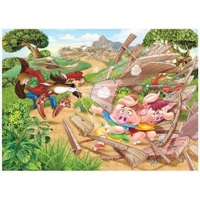 Contem 3 quebra-cabeças que contam a história dos Três Porquinhos. A criança monta os quebra-cabeças e pode ler a história no verso da embalagem.