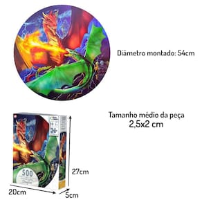 Quebra cabeça Redondo com linda imagem e decorativa imagem De uma super Batalha de Dragões que cospem fogo com 500 peças. Com um design inovador e cores vibrantes, este quebra cabeça proporciona a sensação de superação quando se consegue montar. As cores podem até ajudar, mas o grande segredo está no desenho das peças. Desafie-se!