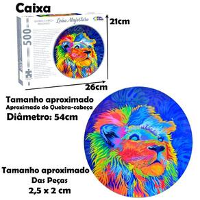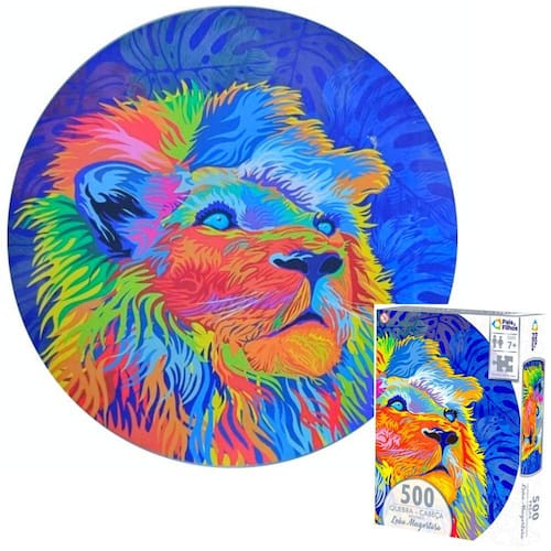 Quebra cabeça Redondo com linda imagem Do Leão Majestoso com 500 peças. Com um design inovador e cores vibrantes, este quebra cabeça proporciona a sensação de superação quando se consegue montar. As cores podem até ajudar, mas o grande segredo está no desenho das peças. Desafie-se!