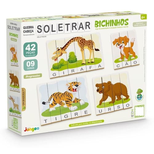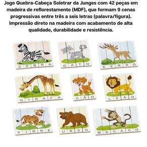 Jogo Quebra-Cabeça Soletrar da Junges com 42 peças em madeira de reflorestamento MDF , que formam 9 cenas progressivas entre três a seis letras palavra/figura . Impressão direto na madeira com acabamento de alta qualidade, durabilidade e resistência. Com o jogo quebra-cabeça de soletrar as brincadeiras se tornam educativas e divertidas Ideal para aprimorar o raciocínio lógico, concentração e atenção. Jogo para associação e iniciação à leitura e escrita, indicado para auxiliar na alfabetização
