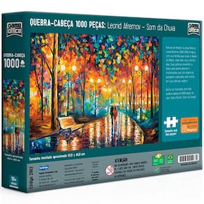 Quebra cabeça som da chuva leonid afremov 1000 peças puzzle ------------------------------------------------ Quebra cabeça som da chuva leonid afremov 1000 peças puzzle - produzido com material especial - peças com encaixe preciso - o melhor material do mundo para quebra cabeças O produto possui padrão de qualidade internacional. Oferecendo a você uma experiência única que une belas imagens ao melhor material do mundo para quebra cabeças. Os encaixes são perfeitos e podem ser sentidos em cada peça Natural de vitebsk na atual belarus. Leonid afremov 1955 - 2019 emigrou com sua família para israel e depois ao méxico, onde viveu seus últimos dias. Suas pinturas encantam a todos pela paleta vibrante e multicolorida, que traz alegria às paisagens capturadas pelo artista em suas diversas viagens. Divirta-se montando este belo quebra cabeça de 1000 peças da obra rains rustle som da chuva ------------------------------------------------ Tamanho montado = 61,9 x 44,9 cm As peças possuem aproximadamente = 1,8 x 1,6 cm ------------------------------------------------ Quais os benefícios de montar quebra-cabeça Além de exercitar a memória visual, montar quebra-cabeças ajuda no desenvolvimento da capacidade de resolução de problemas. A criança ou pessoa analisa e desenvolve estratégias para a montagem, por exemplo, ela pode começar pelas bordas ou separá-lo pelas cores das peças para começar a montagem. Benefícios do quebra-cabeça para crianças - capacidade de concentração e foco; - noção espacial; - desenvolvimento neurológico e psicomotor; - raciocínio lógico; - memória; - resolução de problemas; - persistência; - fortalecimento de laços com amigos e familiares; ------------------------------------------------ Conteúdo da embalagem: - 1 um quebra cabeça som da chuva leonid afremov 1000 peças ------------------------------------------------ - composição: o quebra cabeça é fabricado com um material chamado de papelão azul, o melhor material do mundo para quebra cabeças - este produto contém material reciclado e reciclável. - recomendado para maiores de 10 anos - não recomendável para menores de 3 anos, por conter partes pequenas que podem ser engolidas ou aspiradas. - embalagem fácil de abrir e guardar - marca: game office - produzido por: toyster brinquedos ltda. fundação abrinq, reconhece empresa amiga da criança - feito no brasil ------------------------------------------------ de 3 meses contra defeito de fabricação Informação fornecida pelo fabricante Marca: Não Informado Ean: 7896054029639