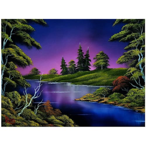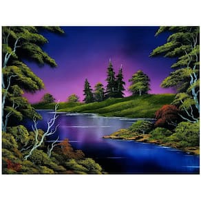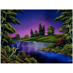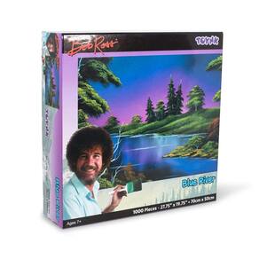 - Design criativo: inspirado no lendário artista Bob Ross, a imagem do quebra-cabeça captura o estilo característico do ícone. A cena noturna apresenta tons azuis e roxos brilhantes pintando o céu, com um rio fluindo cercado por "pequenas árvores felizes"