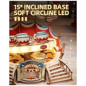 O ROKR LED Wooden Music Box Kit oferece uma experiência única com suas Xícaras de Chá Giratórias, um quebra-cabeça 3D de madeira que leva aproximadamente 5,5 horas para ser concluído. Ao pressionar o botão, as luzes se acendem e a música começa a tocar, enquanto os mini assentos giram automaticamente, proporcionando um encanto especial.